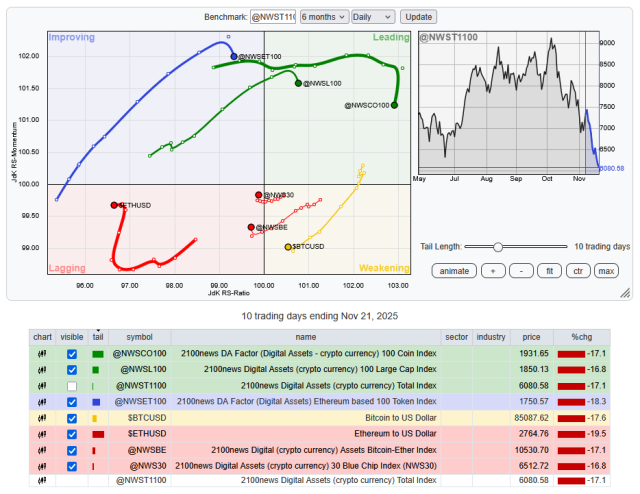 *RRG® charts show the relative strength and momentum of groups of digital assets. Those with strong relative strength and momentum appear in the green Leading quadrant. As relative momentum fades, they typically move into the yellow Weakening quadrant. If relative strength then fades, they move into the red Lagging quadrant. Finally, when momentum picks up again, they shift into the blue Improving quadrant.