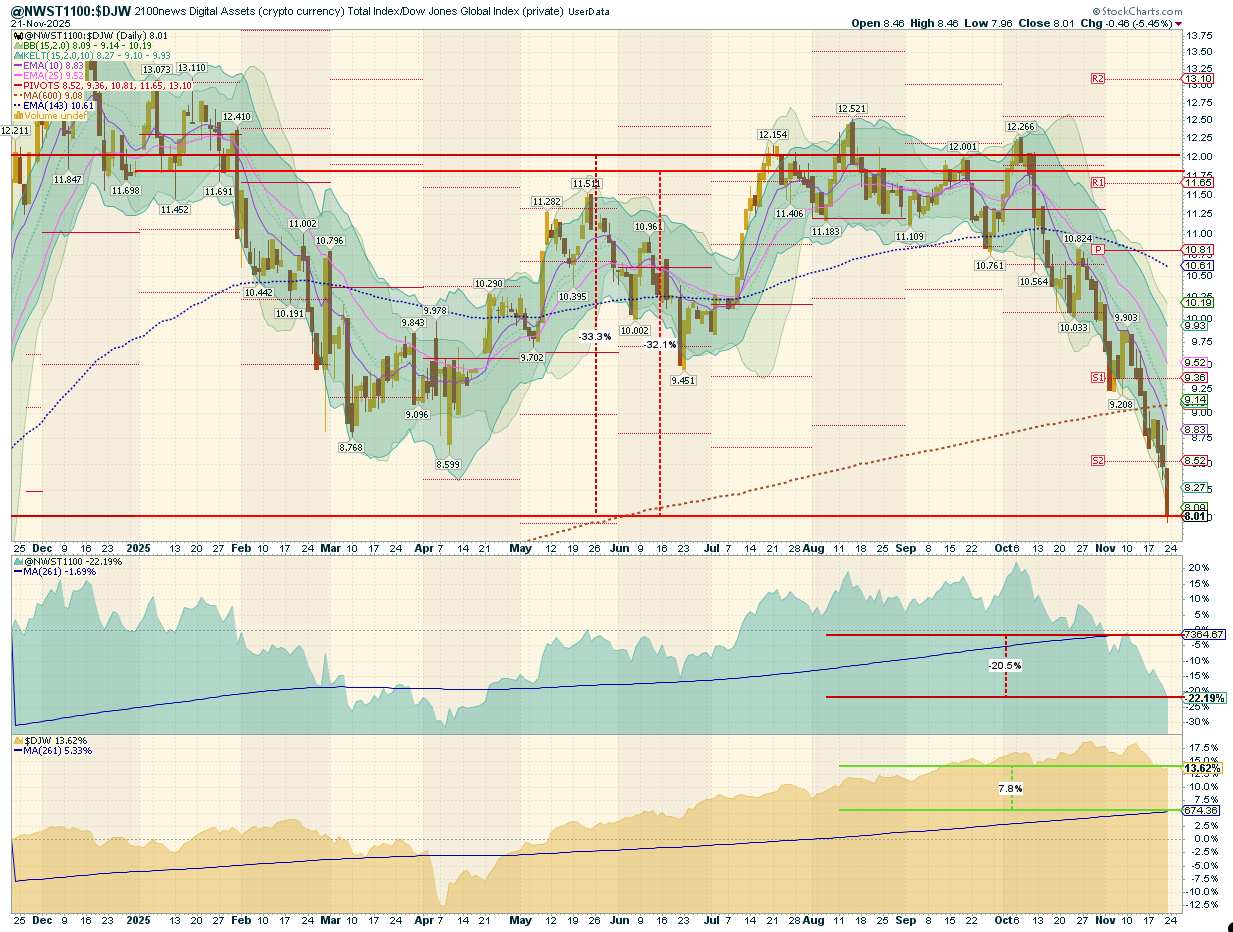 4. The Breadth indicators at the bottom of the first chart (NWST1100) may stabilize: The Advance-Decline Volume Line (ADVL), adapted by 2100News for the crypto market as ADVPL, tracks the net money volume of advancing versus declining digital assets. It may stabilize briefly as selling intensity cools. The McClellan Summation Index, a long-term version of the McClellan Oscillator that measures market breadth, may also flatten, hinting at initial stabilization in participation.