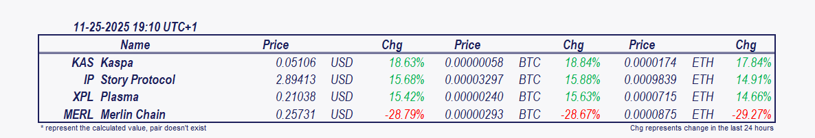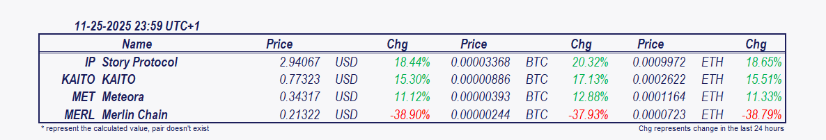 • Story Protocol and KAITO: Since 7 pm Story Protocol has increased by 1.61%, KAITO by 6.92%.