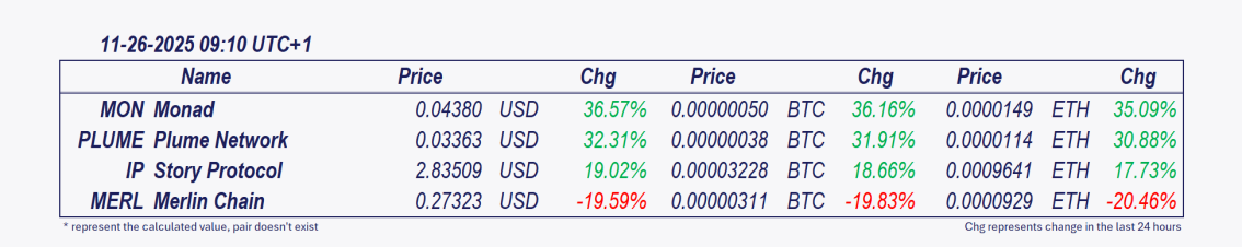 • Monad and Plume Network: These cryptocurrencies have been the best performers over the past 24 hours, with Plume Network posting the most significant intraday gain since midnight, soaring 34.14%. 💡PLUME’s surge reflects a confluence of exchange-driven liquidity, technical momentum, and RWA narrative strength. However, 68% of its supply remains locked until 2028, and Korean retail pumps often see profit-taking. Key watch: Can PLUME sustain volume above $150M and attract institutional inflows via Nest vaults post-listing?