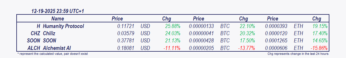 - Humanity Protocol and Chiliz: Since 7 pm Humanity Protocol has surged 23.85%, Chiliz has increased by 0.84%