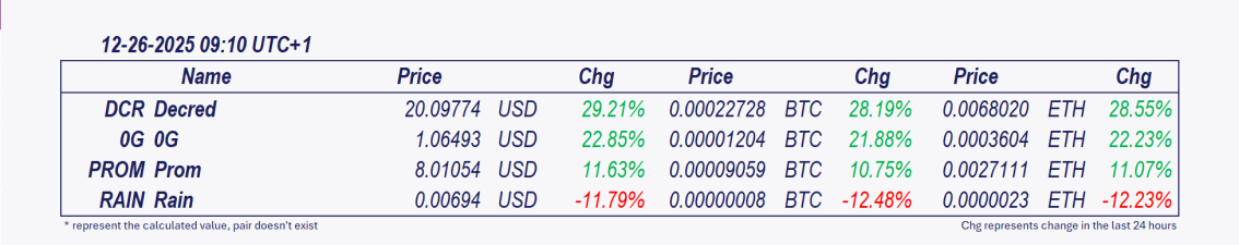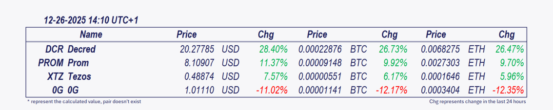 • Decred and Prom: These cryptocurrencies have been the best performers over the past 24 hours.