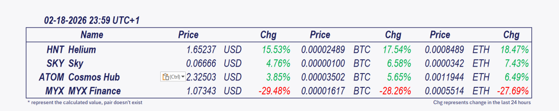 • Helium and Sky: These cryptocurrencies have delivered explosive performance over the past day, with Sky increasing by 2.46% since the 7 p.m. update, leading late-session gains. 💡Cautiously Positive Sky’s gain is primarily a beta play on early altcoin rotation, not fundamental strength. Key watch: Can SKY break and hold above $0.068 to confirm the rotation has legs, or will it fade back with a weakening Altcoin Season Index?