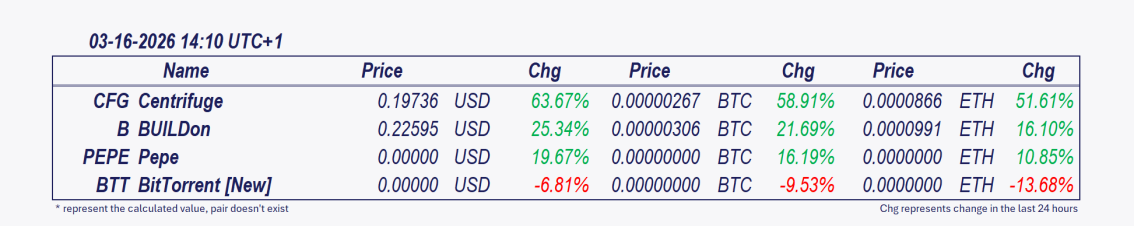 - Centrifuge and BUILDon: These cryptocurrencies have been the best performers over the past 24 hours, with Centrifuge leaping 63.35% since the morning update. 💡Bullish Momentum The surge is a classic high-volume breakout, suggesting strong conviction. However, moves this rapid often see sharp corrections if support fails. Key watch: Can CFG establish a new support base above $0.200, or will the volume dry up and lead to a volatile reversal?
