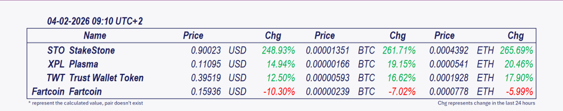• StakeStone and Plasma: These cryptocurrencies have been the best performers over the past 24 hours, with StakeStone posting the crypto market’s most significant intraday gain since midnight, leaping 93.65%. 💡 Bullish Momentum The surge is a textbook volume-led breakout, demonstrating strong short-term demand but lacking a fundamental anchor. The key risk is that such parabolic moves often see equally sharp corrections when volume recedes. Key watch: Can STO establish a new consolidation range above $0.50, or will the high turnover lead to a volatile shakeout?