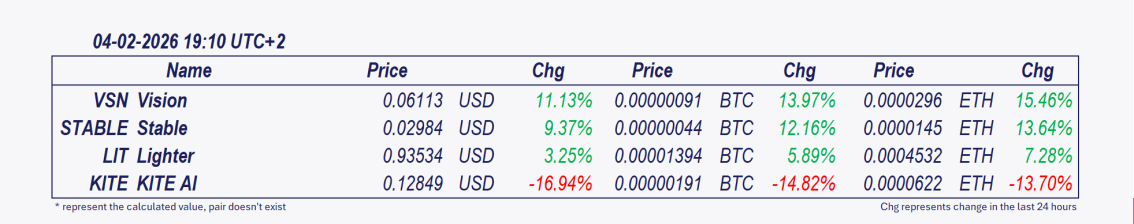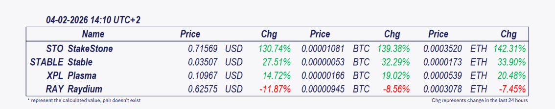 • StakeStone and Stable: These cryptocurrencies have been the best performers over the past 24 hours, with Stable rising by 10.45% since the morning update. 💡Bullish Momentum Stable’s surge is a classic case of a technical rebound supercharged by a short squeeze, setting a clear near-term target at $0.040. Key watch: Whether the token can consolidate above $0.032 and attract follow-through buying to challenge the $0.040 resistance in the next 24-48 hours.