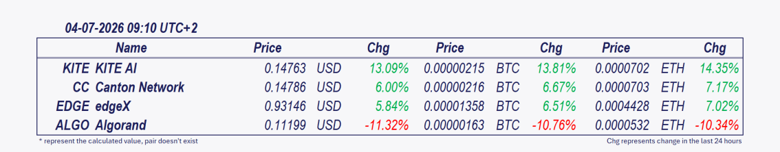 • Kite and Canton Network: These cryptocurrencies have been the best performers over the past 24 hours.