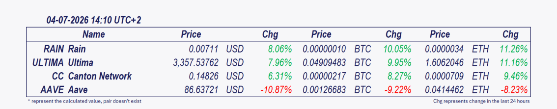 • Rain and Ultima: These cryptocurrencies have been the best performers over the past 24 hours, with Rain rising by 12.63% since the morning update. 💡Cautiously Bullish (Short-Term) RAIN’s gain is a beta play on altcoin momentum, but the imminent large token unlock introduces a key supply-side risk. Key watch: Monitor trading volume and price action around the $254.93M token unlock to gauge if selling pressure materializes.