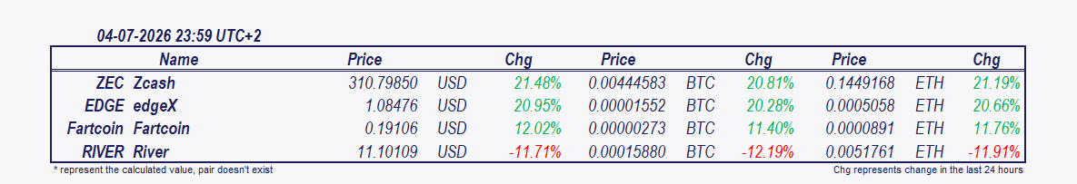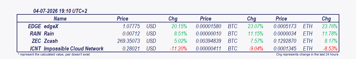 • edgeX and Zcash: Since 2 pm edgeX has increased by 12.79%, Zcash by 1.89%.