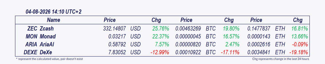 • Zcash and Monad: These cryptocurrencies have been the best performers over the past 24 hours.