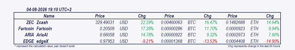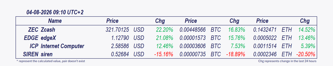 • Zcash and edgeX: These cryptocurrencies have been the best performers over the past 24 hours.