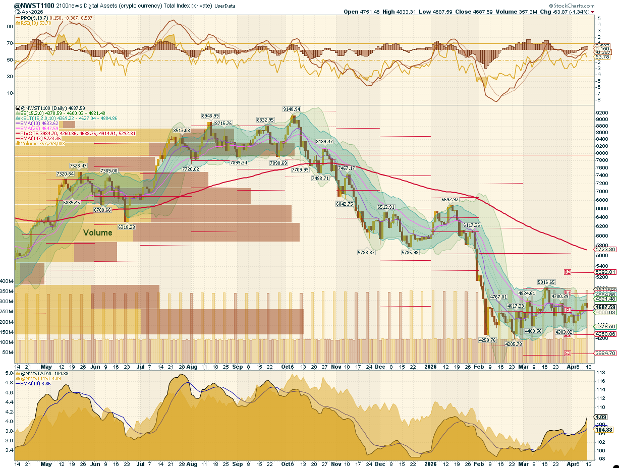 2. Attention has also shifted toward breadth metrics at the bottom of the NWST1100 chart. Market breadth indicators have confirmed that this is not a superficial move but a structurally supported shift, fundamentally different from prior rebounds that lacked participation and quickly failed. The Advance-Decline Volume Line (ADVPL) — 2100News’s proprietary adaptation of the AD Line for the crypto market — has been rising steadily since April 2, signaling consistent capital inflows. The McClellan Summation Index, a long-term breadth indicator, has transitioned into a clear uptrend, confirming that participation is expanding across the market.
