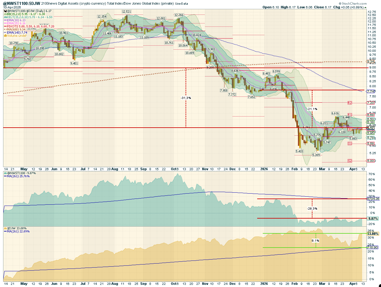 • The mean reversion theory suggests that asset prices tend to revert to their historical average returns over time. The current NWST1100-to-DJW price ratio, which is below the long-run mean, may indicate that digital assets are undervalued relative to historical trends.
