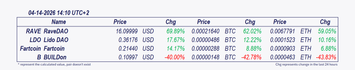 • RaveDAO and Enjin Coin: Since 7 pm RaveDAO has increased by 8.42%, Enjin Coin is 7.13% higher.