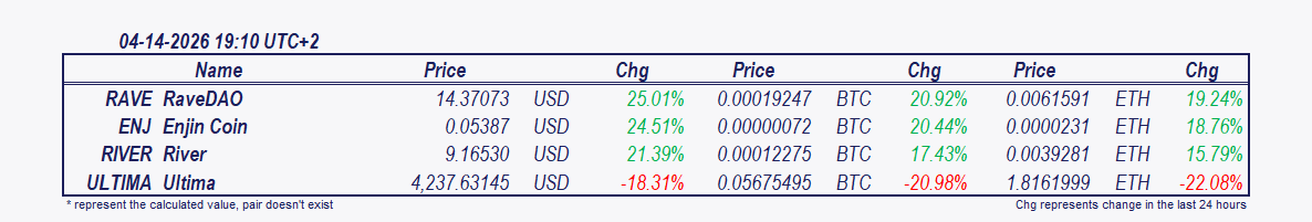 • Enjin Coin and River: Since 2 pm Enjin Coin has increased by 12.37%, River by 5.75%.