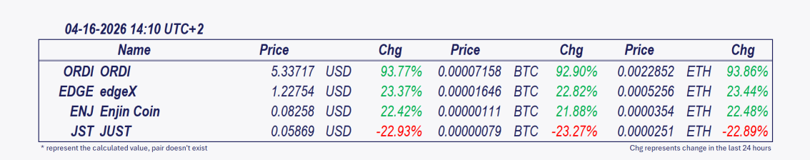 - ORDI and EdgeX: These cryptocurrencies have been the best performers over the past 24 hours, with ORDI surging 23.92% since the morning update. 💡Bullish Momentum with High Volatility Risk ORDI’s parabolic move is a classic sign of a momentum-driven altcoin surge, fueled by sector rotation and speculative trading. Key watch: Can ORDI consolidate above $5, or will profit-taking trigger a reversal to fill the gap from its explosive rally?