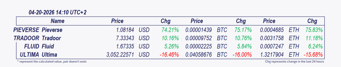 • Pieverse and Tradoor have been the best performers over the past 24 hours.