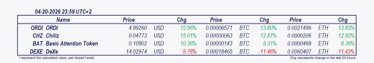 - ORDI and Chiliz: Since 7 pm ORDI has increased by 9.71%, Chiliz by 7.41%.