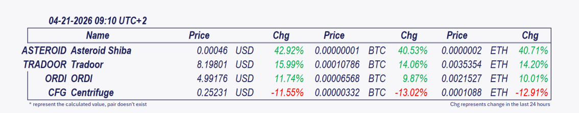 • Ateroid Shiba and Tradoor have been the best performers over the past 24 hours, with Ateroid Shiba posting the crypto market’s most significant intraday gain since midnight, surging 25.30%. 💡Bullish Momentum (High Risk) ASTEROID is riding a powerful wave of meme sector frenzy, amplified by a unique, emotionally charged SpaceX story and visible whale support. Key watch: Can trading volume above $80 million sustain for another 24 hours, or will it fade and trigger a steep reversal?