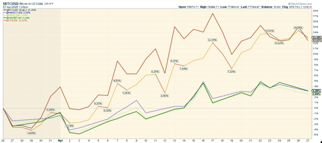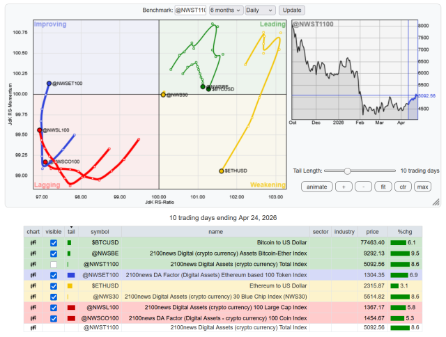*RRG® charts show the relative strength and momentum of groups of digital assets. Those with strong relative strength and momentum appear in the green Leading quadrant. As relative momentum fades, they typically move into the yellow Weakening quadrant. If relative strength then fades, they move into the red Lagging quadrant. Finally, when momentum picks up again, they shift into the blue Improving quadrant.