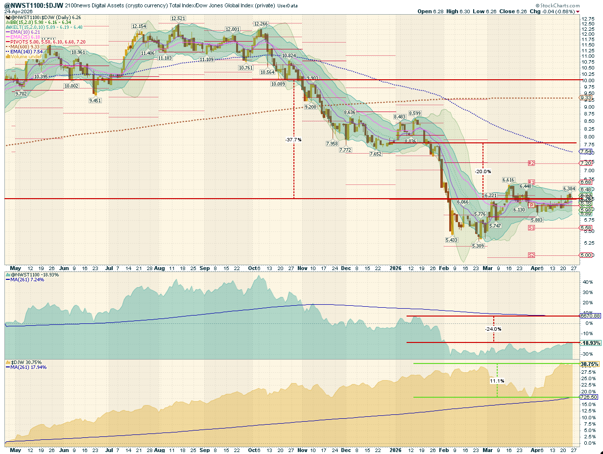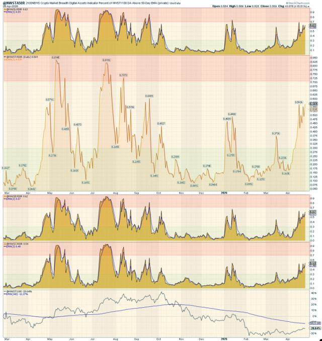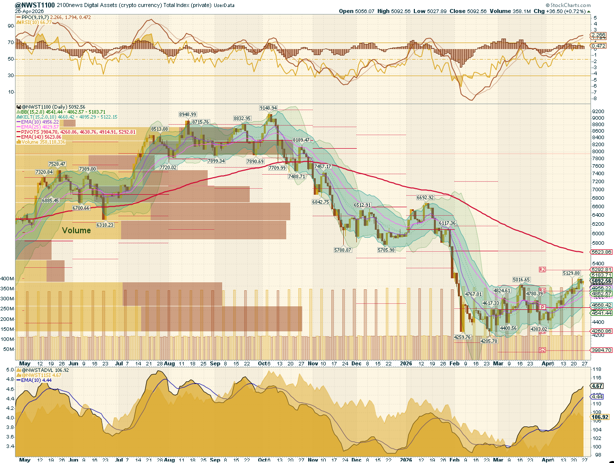 2. Attention has also shifted toward breadth metrics at the bottom of the NWST1100 chart. Market breadth indicators have remained constructive but are no longer one-directional. The Advance-Decline Volume Line (ADVPL) — 2100News’s proprietary adaptation of the AD Line for the crypto market — rose strongly from early April into mid-month, confirming real capital inflows. That inflow sequence now appears to have paused, suggesting short-term digestion rather than continued acceleration. The McClellan Summation Index, a long-term breadth indicator, remains in an uptrend, confirming that participation has broadened.
